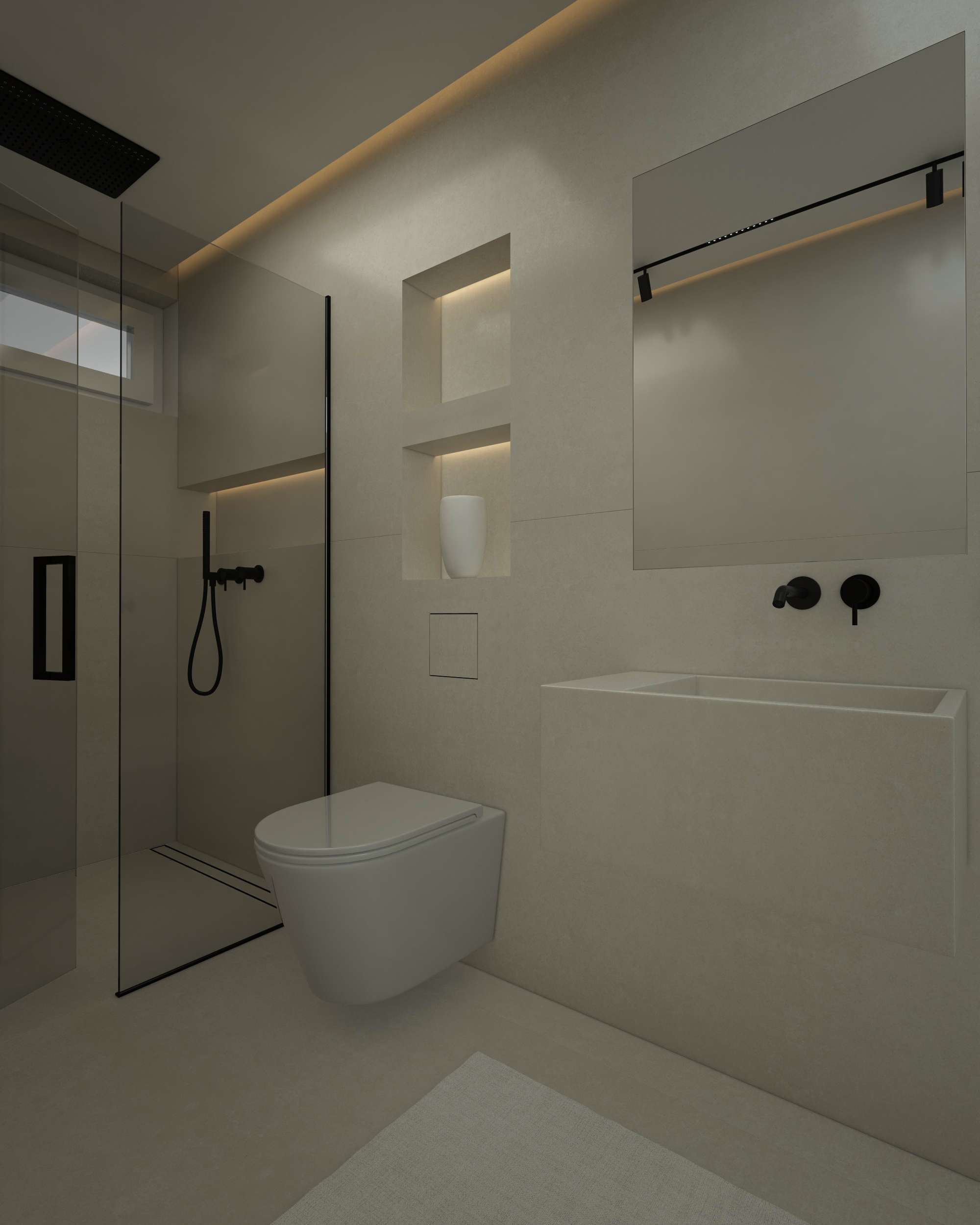 Hier befindet sich auch das elegante Tageslichtbad mit grosser begehbarer Dusche.