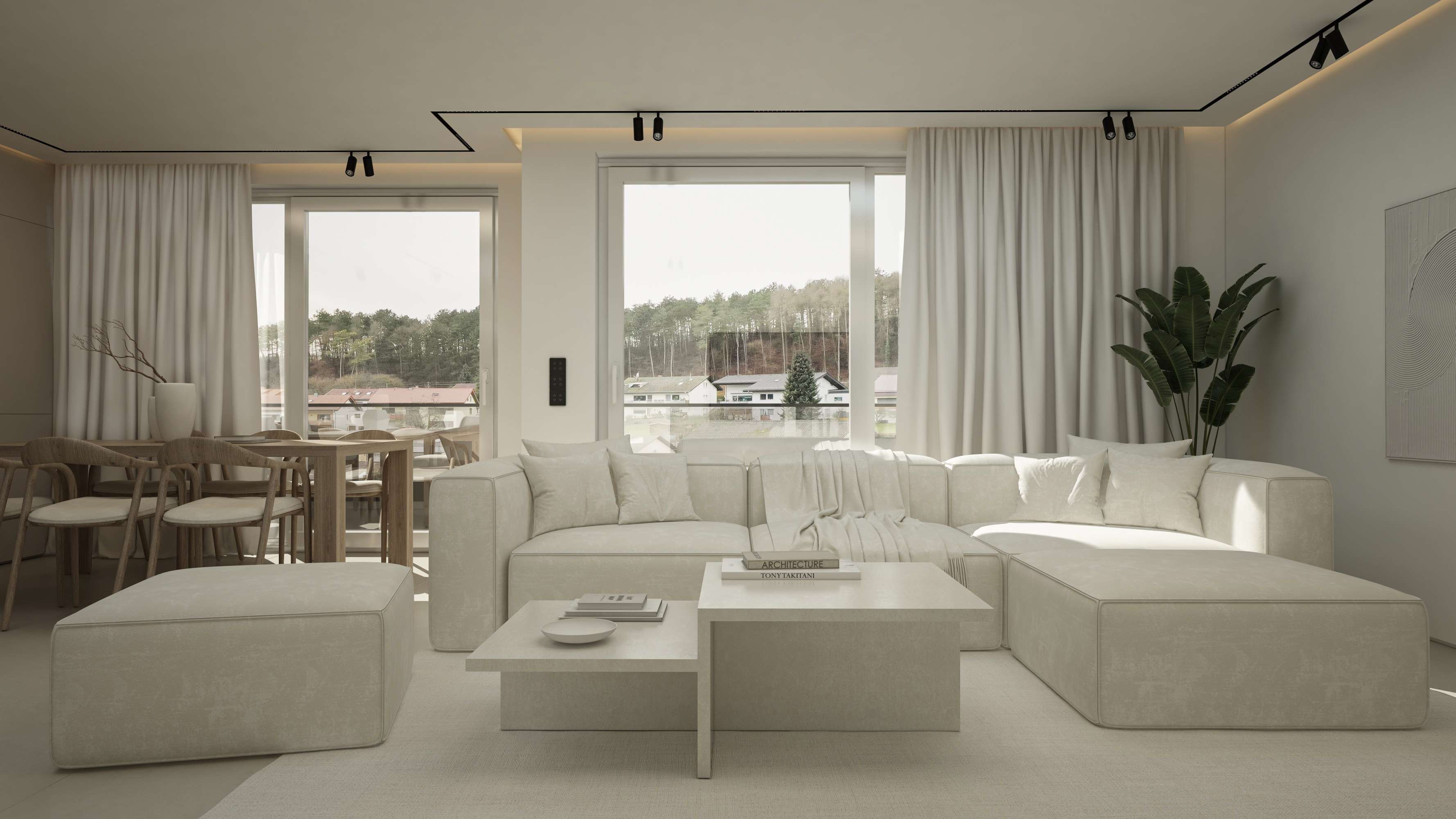Der großzügige Koch-Wohn- und Essbereich besticht durch seine bodentiefen Fenster und viel Licht.