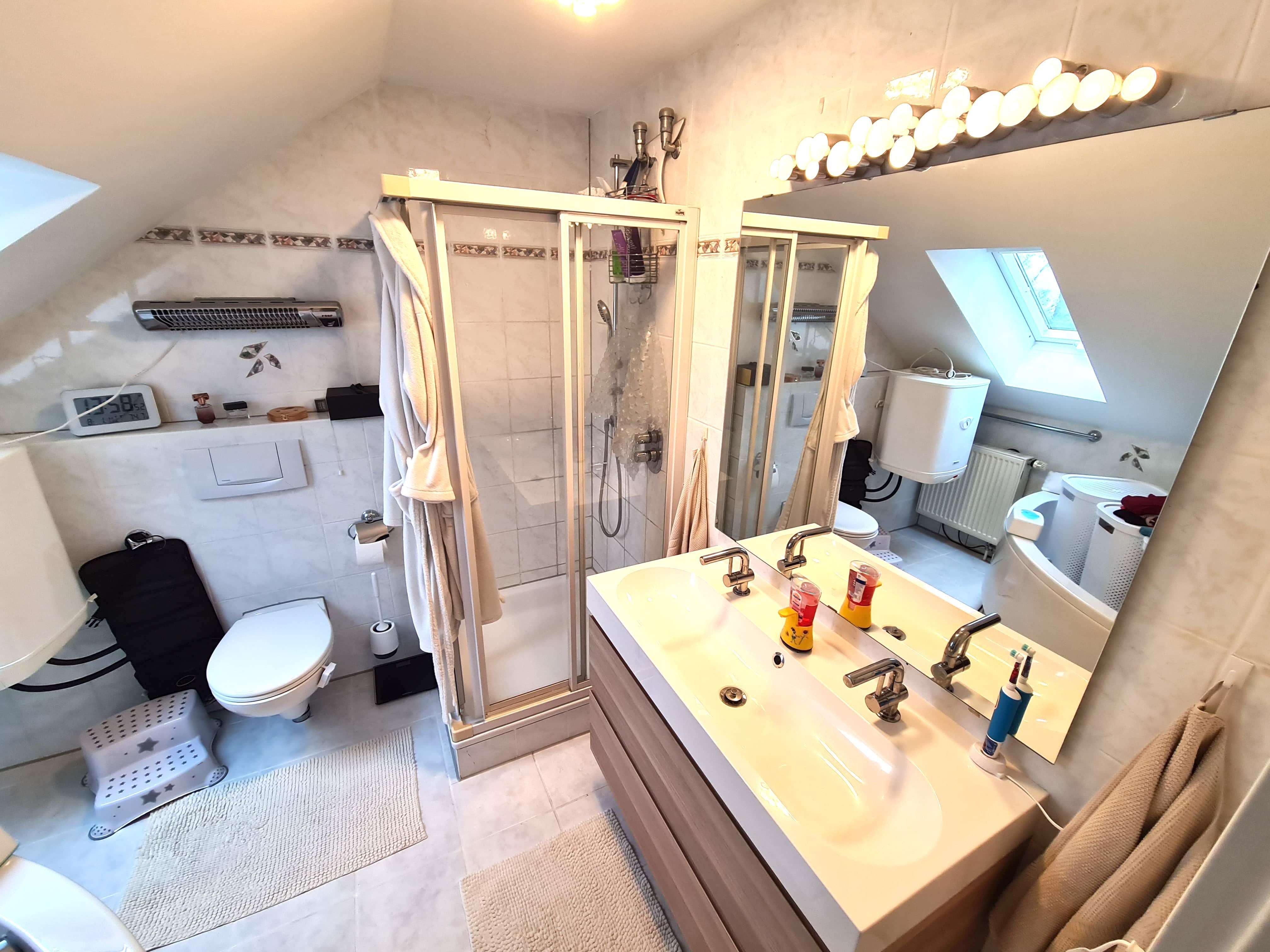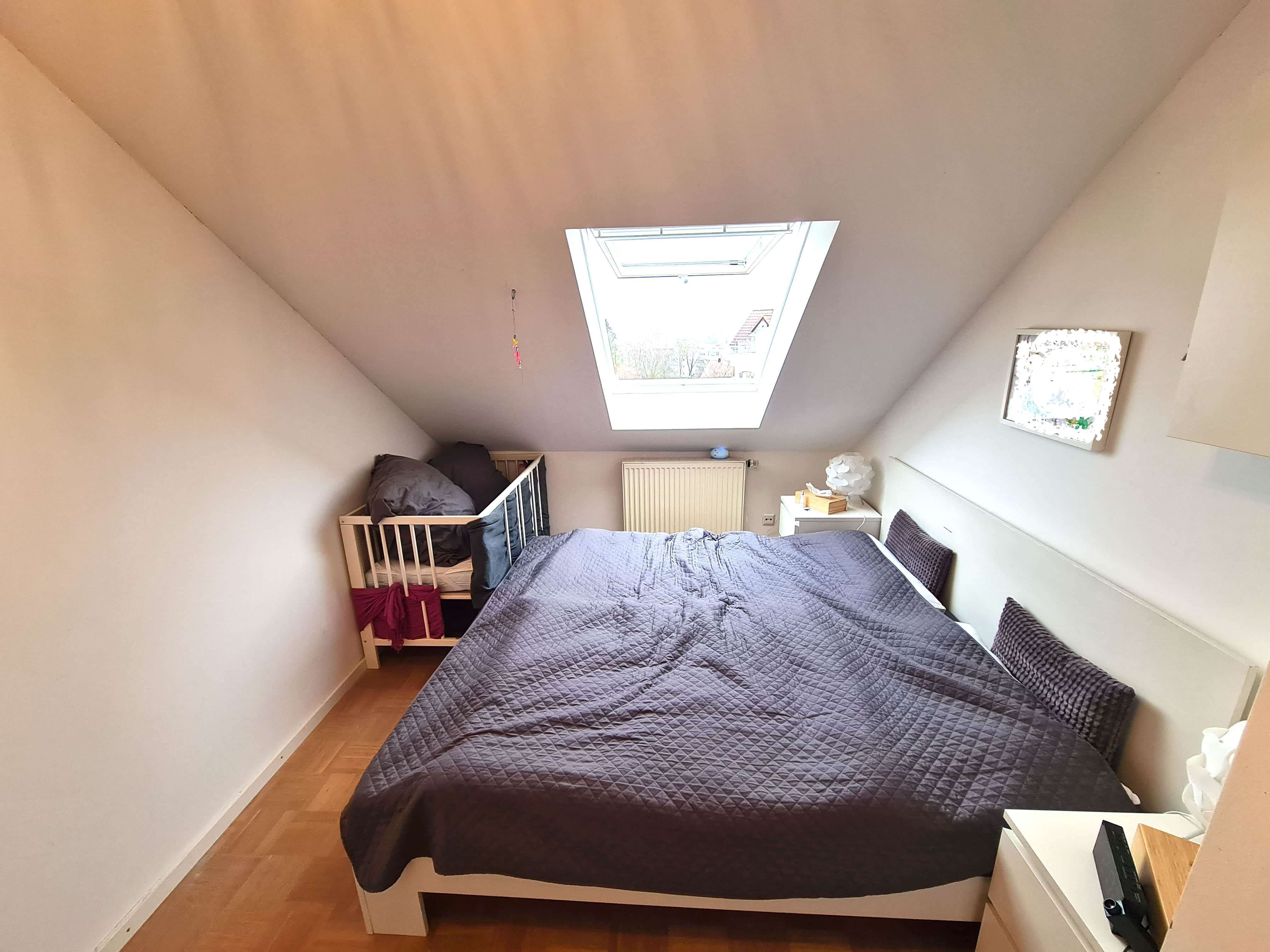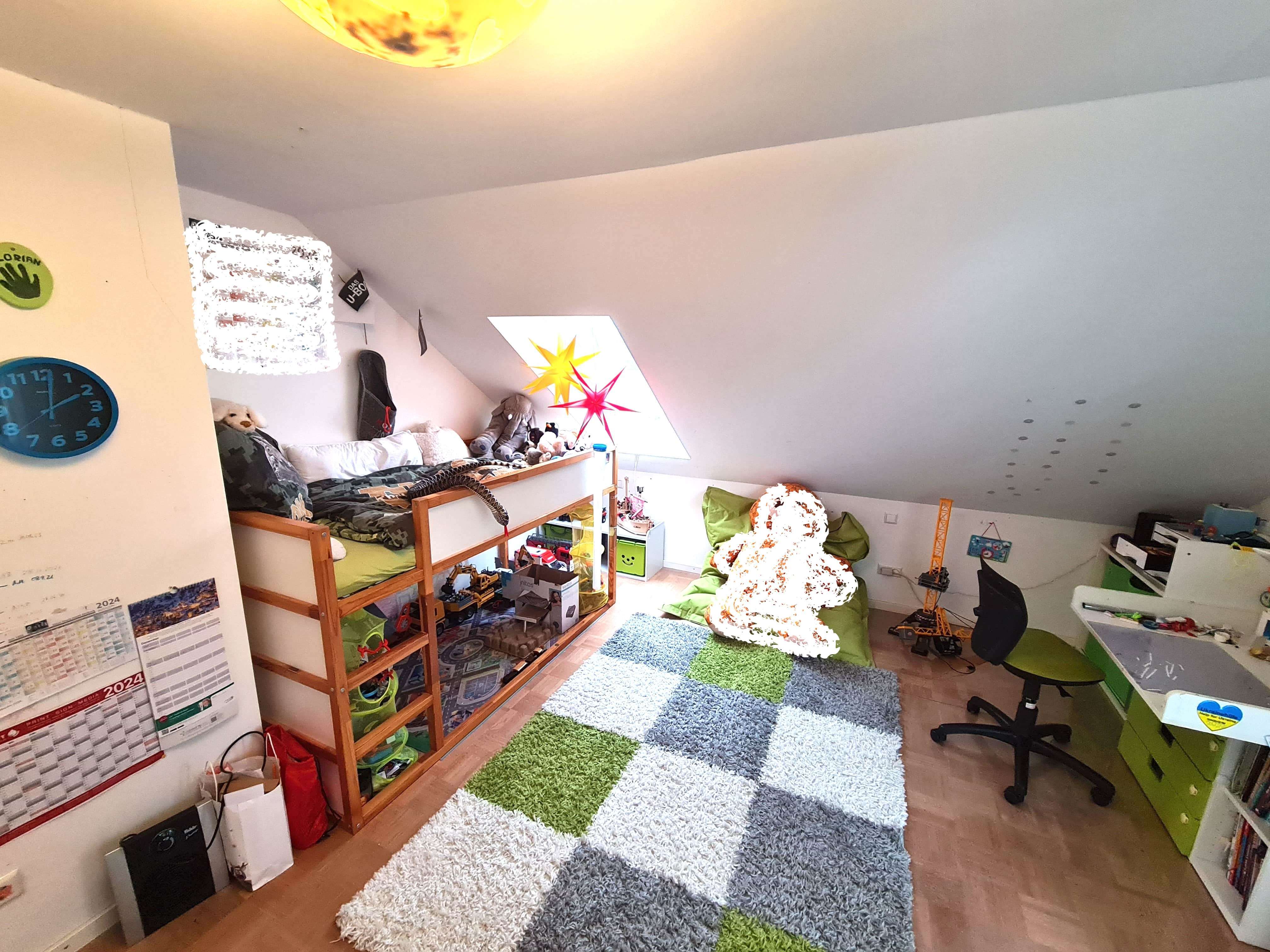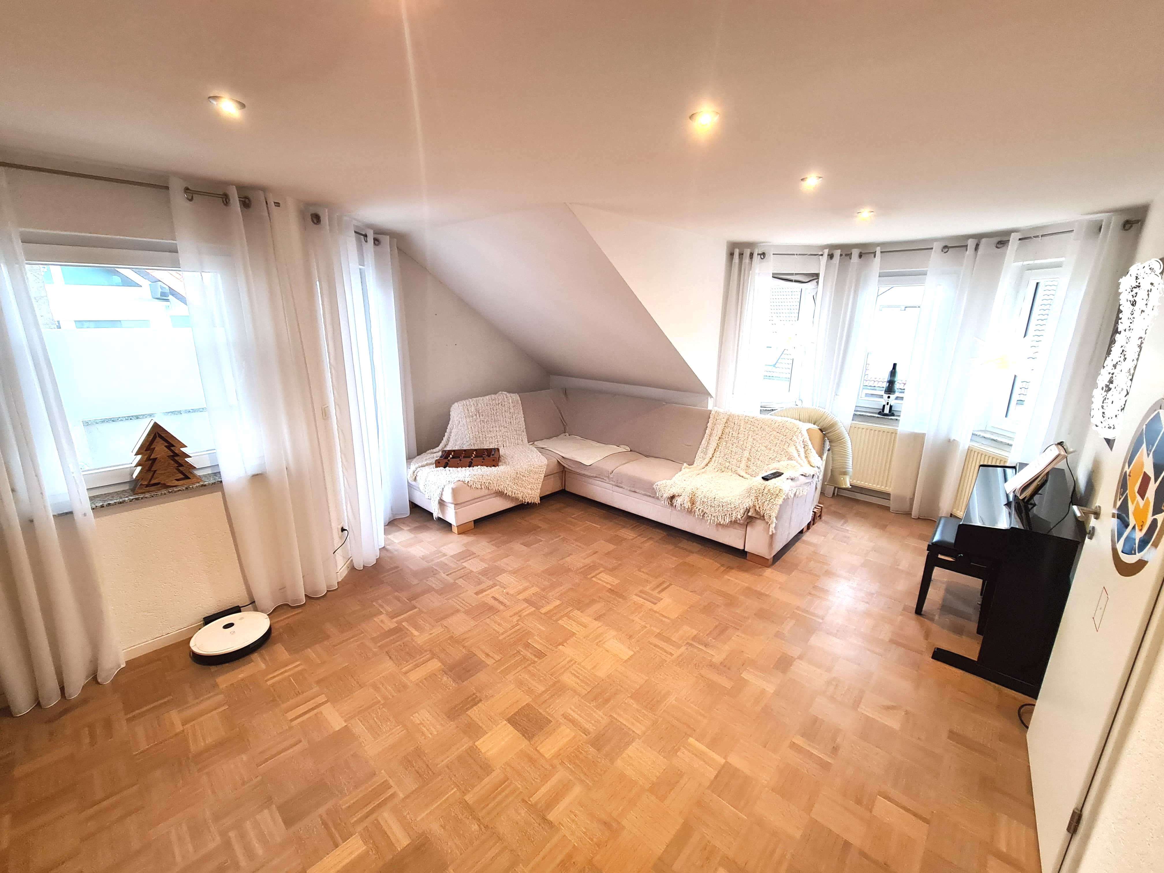 Das Dachgeschoss ist unterteilt in 2 Schlafzimmer mit vielen Nutzungsmöglichkeiten, eines der beiden Zimmer mit Balkonzugang, sowie ein großes Wohnzimmer ebenfalls mit Zugang zum Balkon und ein Tageslichtbadezimmer mit Dusche, sowie einer Eckbadewanne.