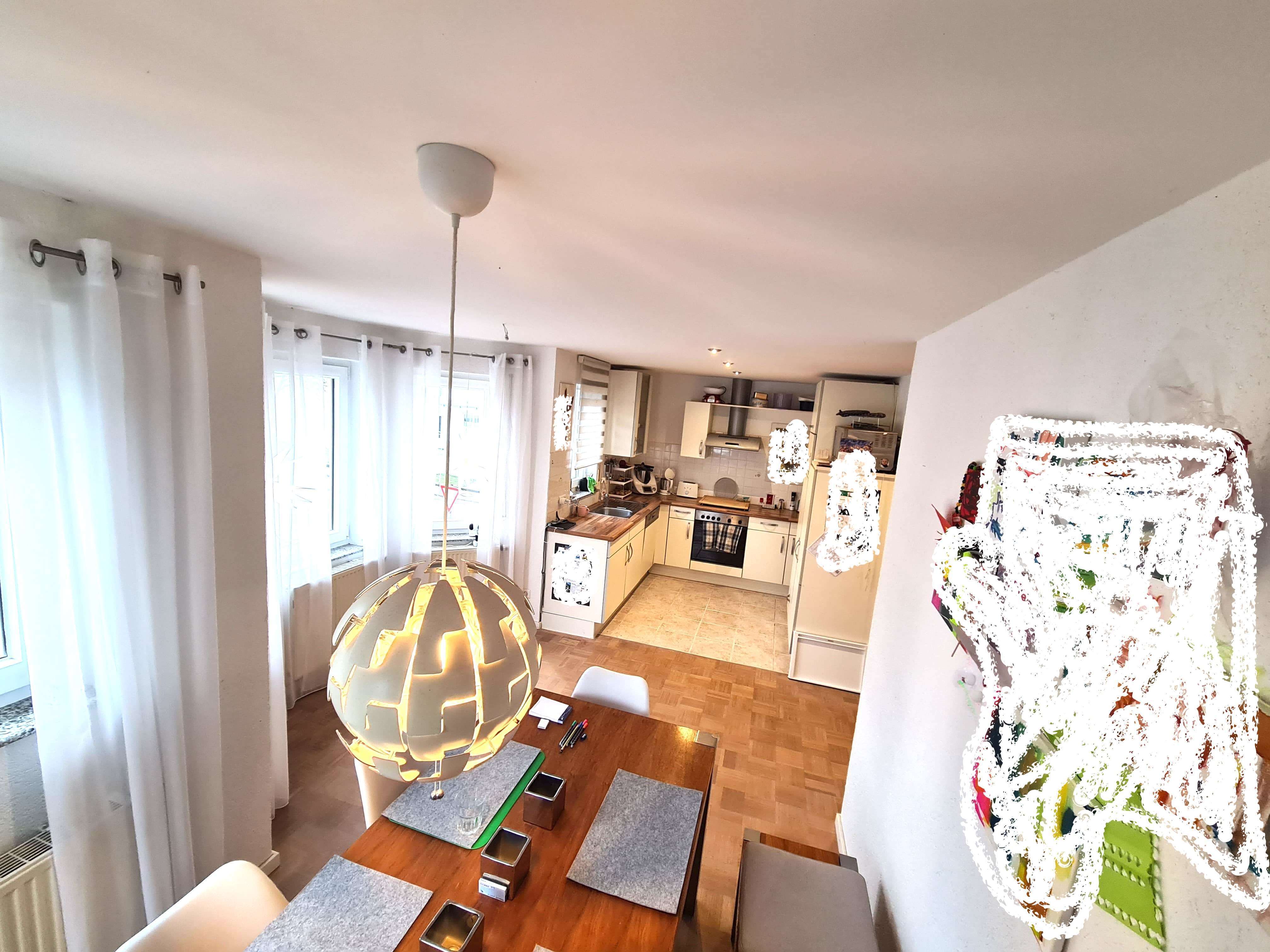 Im unteren Bereich betritt man den offenen Koch-Essbereich mit schönem Erker, ein Gäste WC sowie den offenen Treppenaufgang ins Obergeschoss (DG).