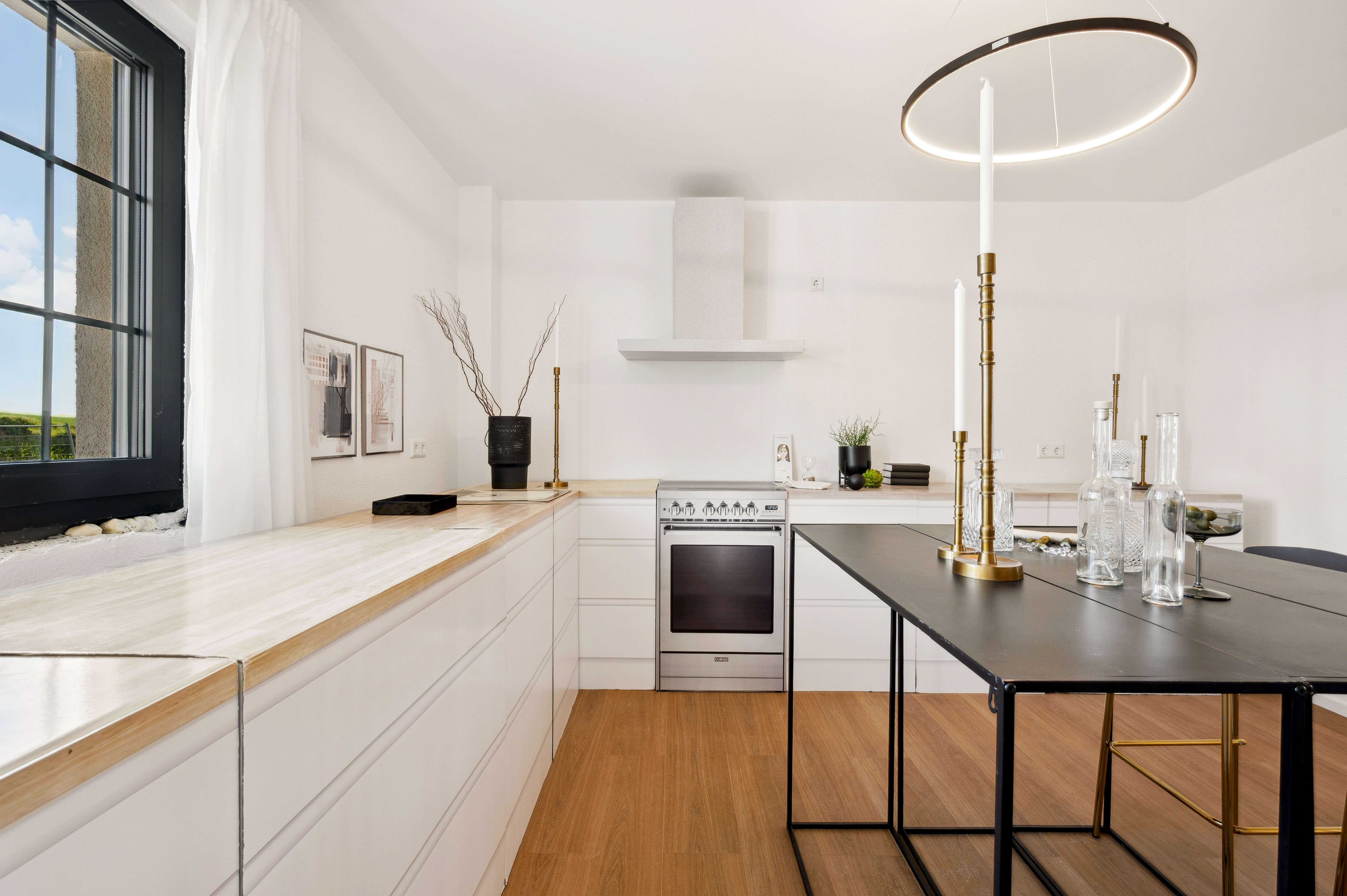 Im Erdgeschoss gelangen Sie über einen breiten Flur zu allen wichtigen Räumen. Die großzügige Küche bietet ausreichend Platz für eine kleine Insel oder Essecke, und der helle Essbereich ist angrenzend an den großen Wohnbereich mit beeindruckender Fensterfront. Der geräumige Wohnbereich hat Zugang zu einem Balkon und dem Garten, was perfekte Bedingungen für entspannte Stunden im Freien schafft. Ein modernes Gäste-WC rundet das einladende Design ab.