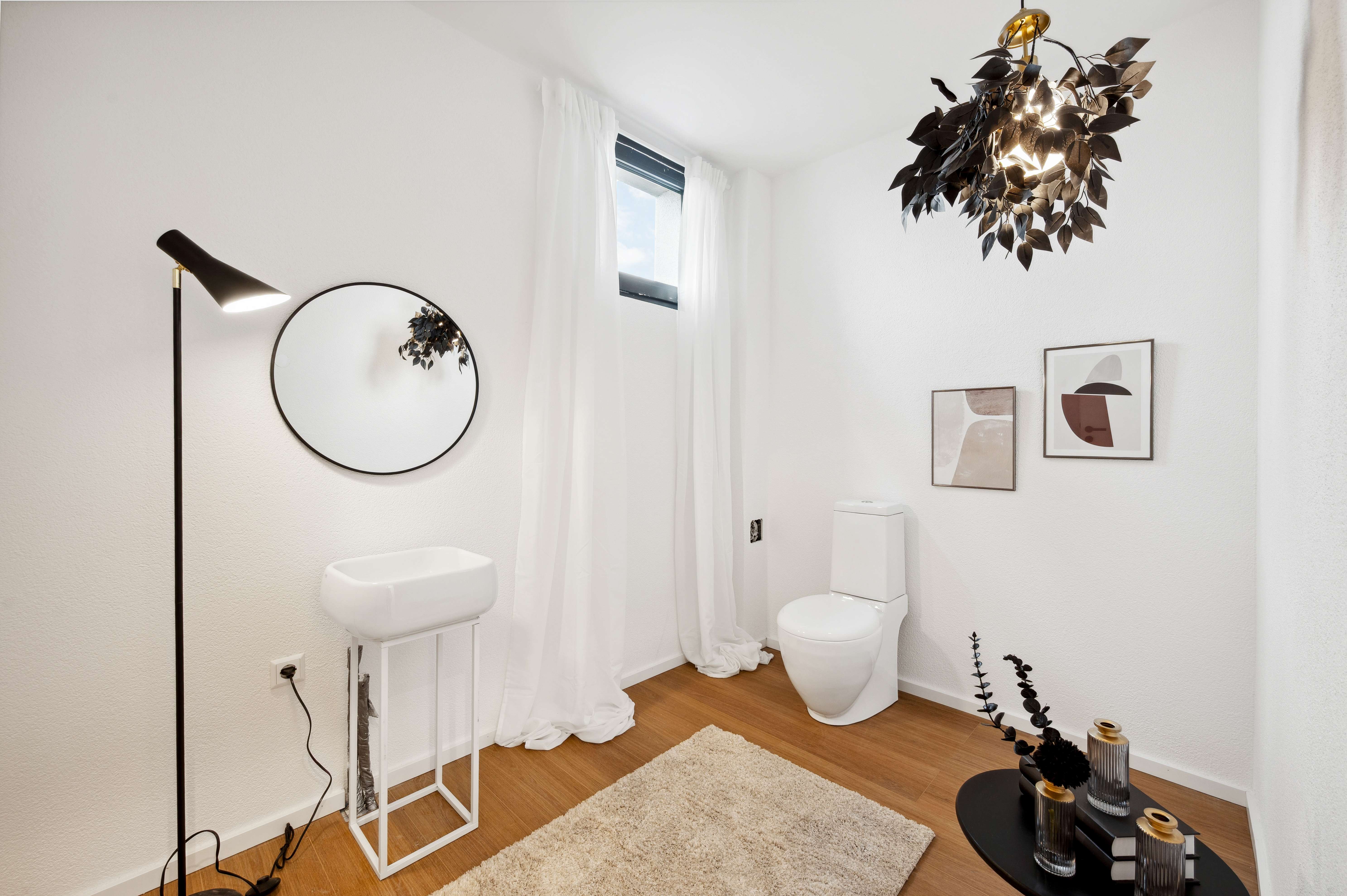 – Hochwertige Sanitärinstallationen in modernem Design: Weiße Badkeramiken und Armaturen – elegant und zeitgemäß.