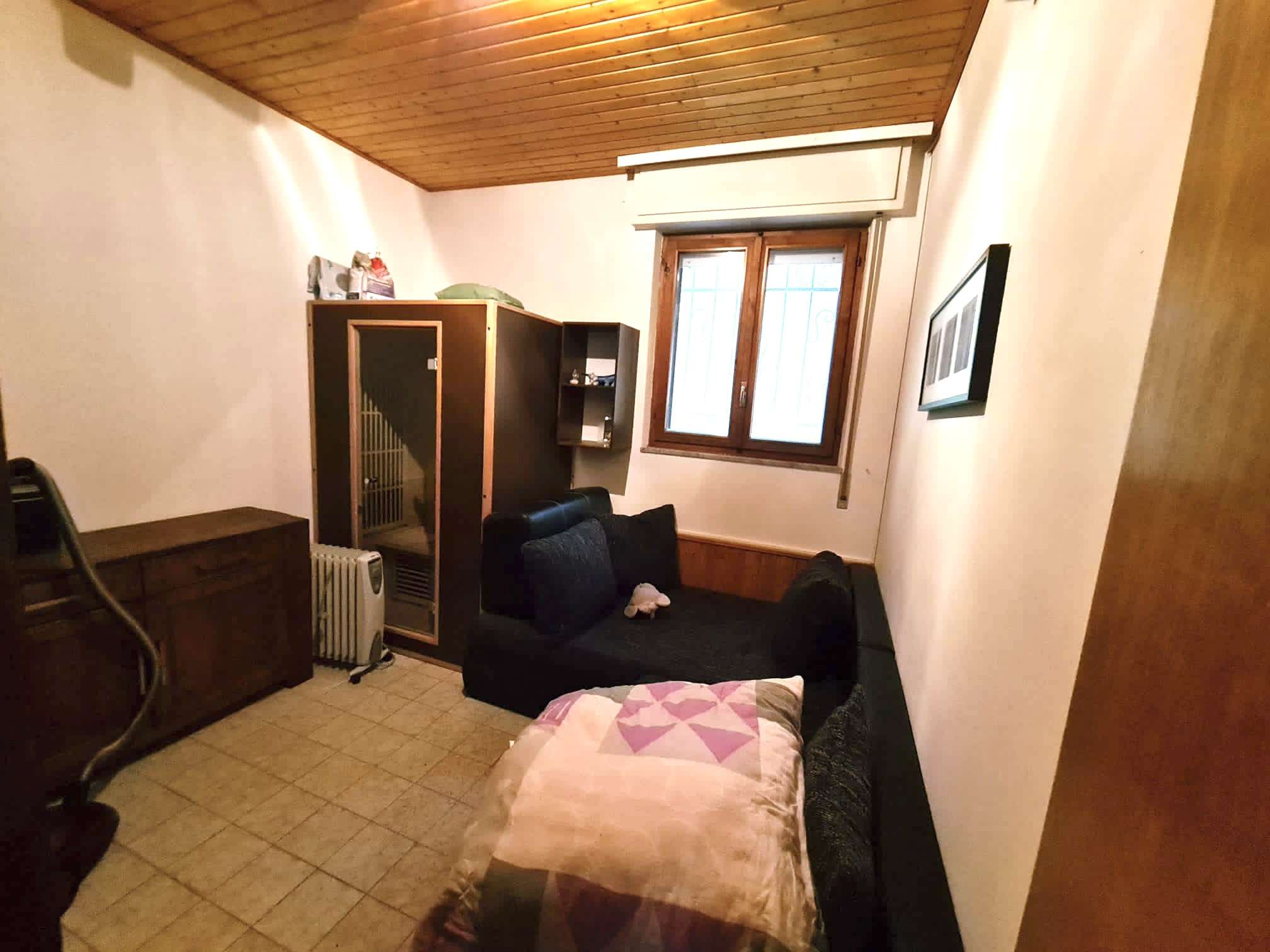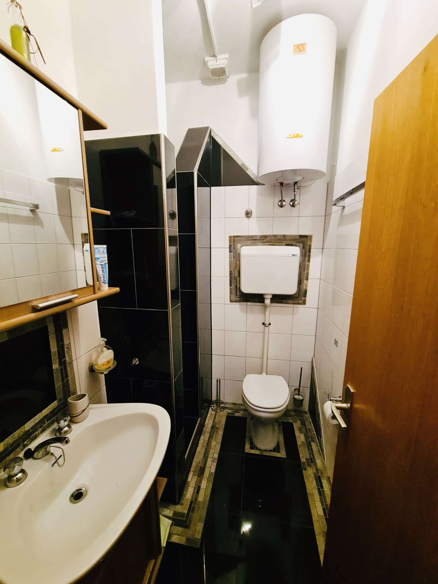 Neben dem Eingang im hinteren Bereich der Wohnung befindet sich das Schlafzimmer, angrenzend das Bad mit Dusche, Tageslicht und Infrarotkabine.