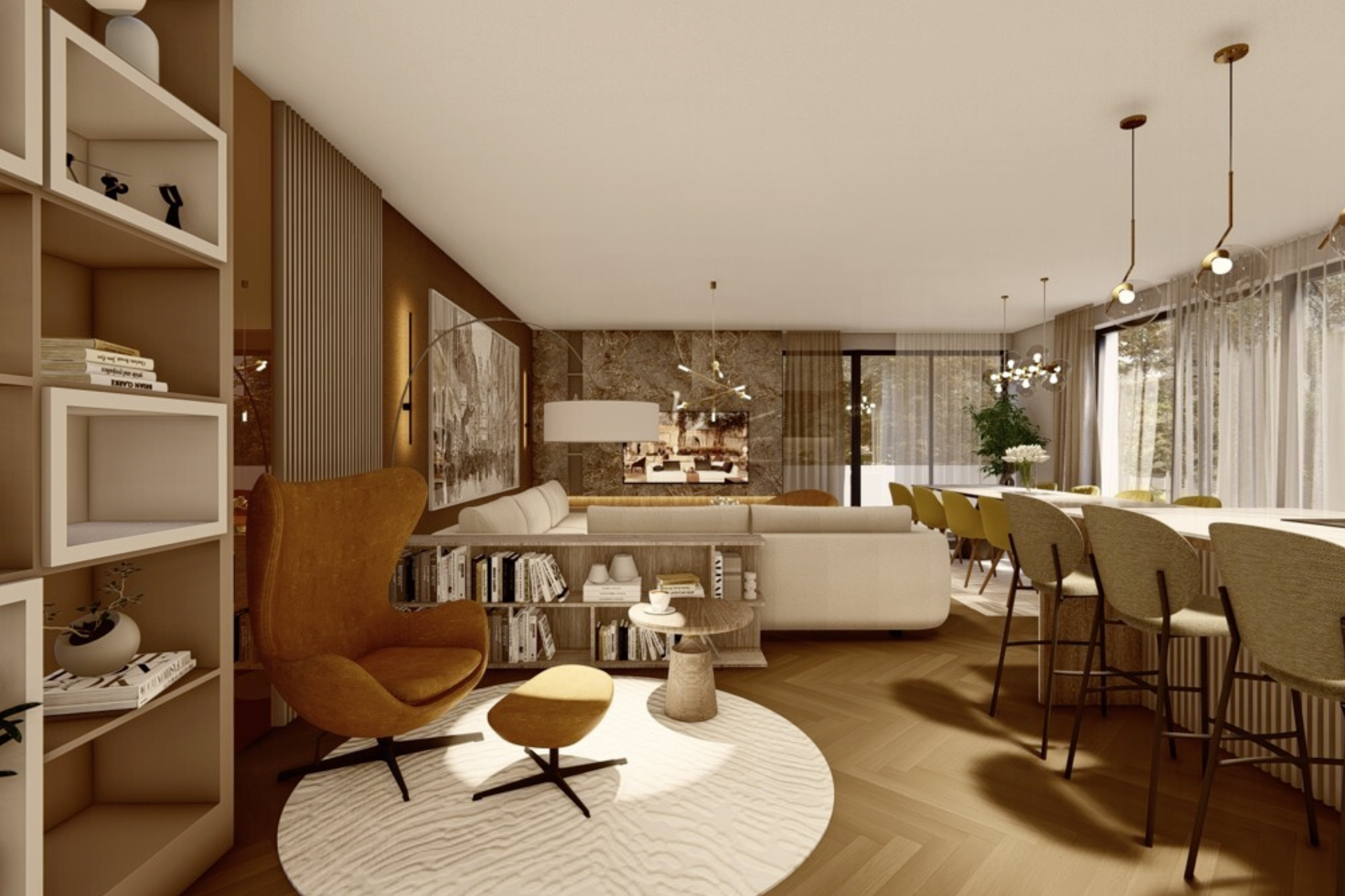 Das Herzstück dieser Immobilie ist der beeindruckende und lichtdurchflutete Wohn- und Essbereich der sich über ca. 52 qm erstreckt und Zugang auf den grossen Balkon bietet.