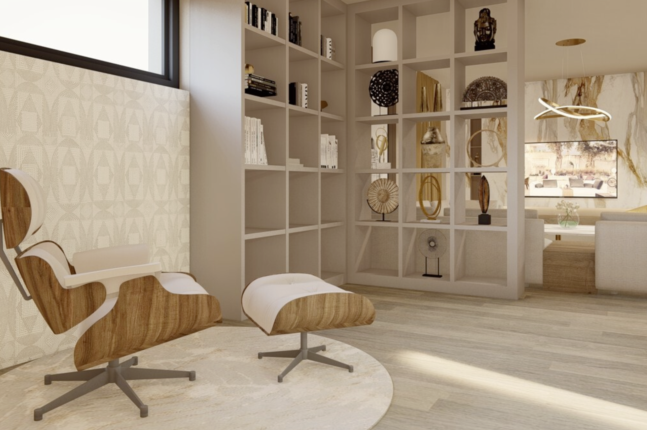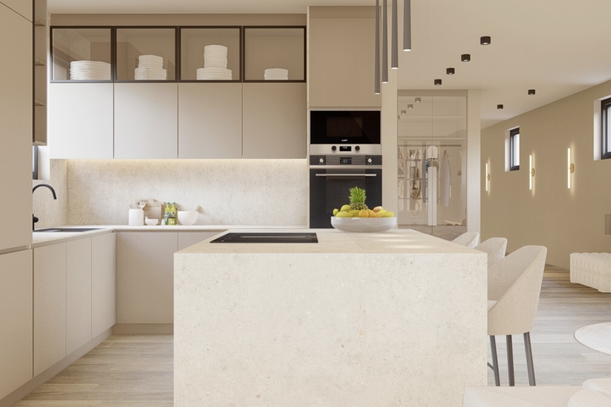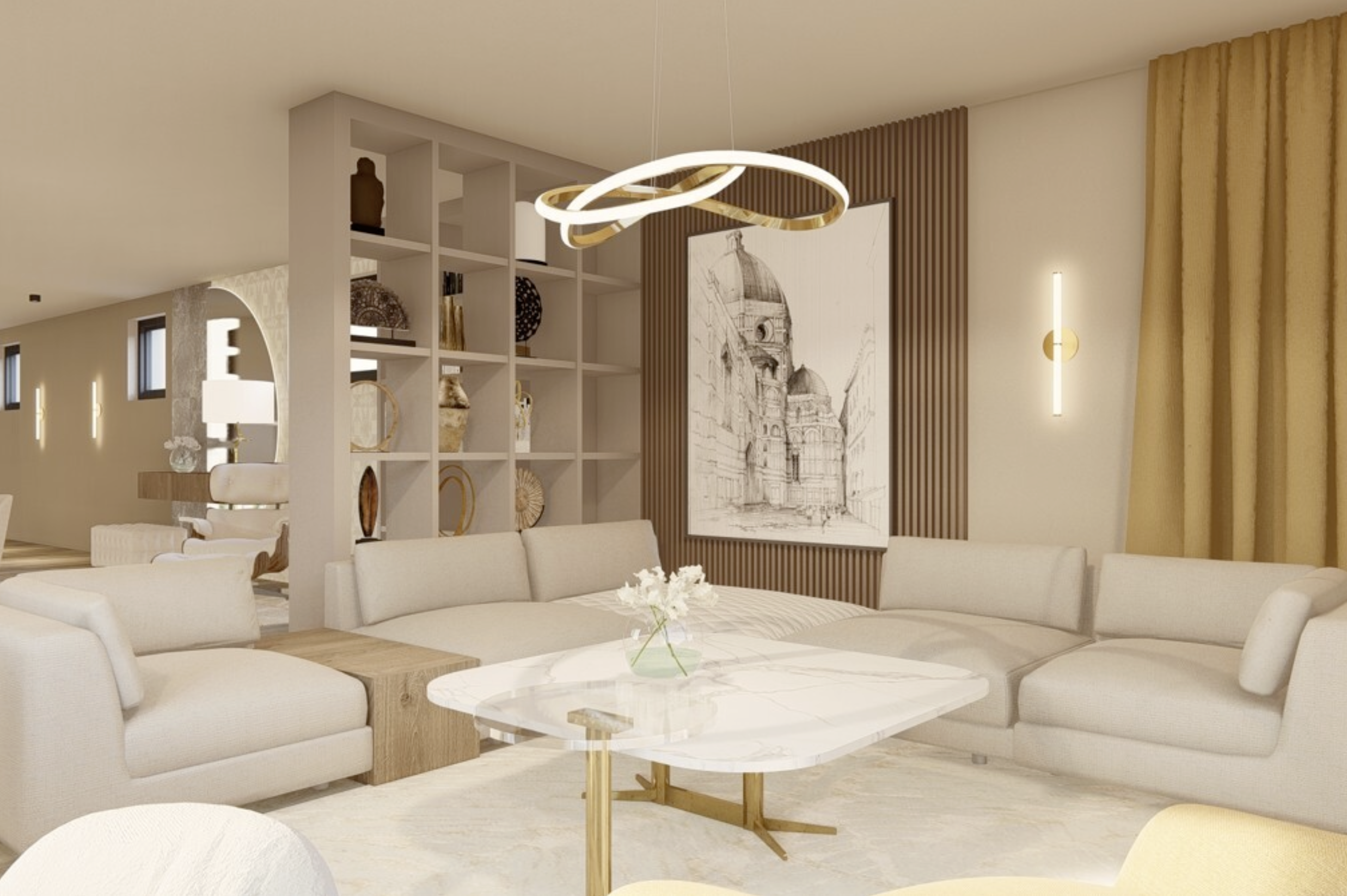 Das Herzstück dieser Immobilie ist der beeindruckende und lichtdurchflutete Wohn- und Essbereich der sich über ca. 52 qm erstreckt und Zugang auf den grossen Balkon bietet.